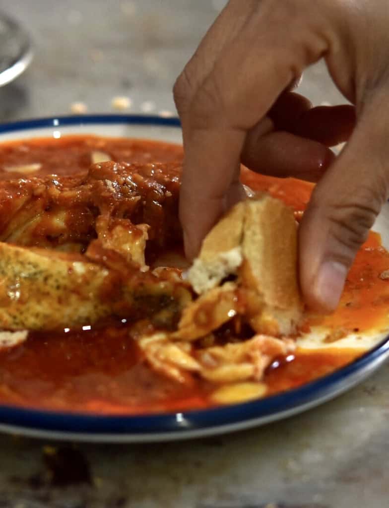 כל הסיפור הוא רוטב אדום סמיך סמיך המבוסס על שמן זית, פפריקה וקימל טחון,