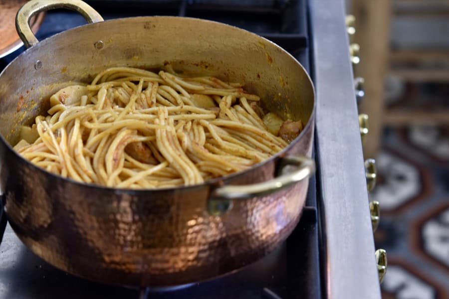 מוסיפים מים רותחים לכיסוי ומבשלים עד שהפסטה מוכנה.