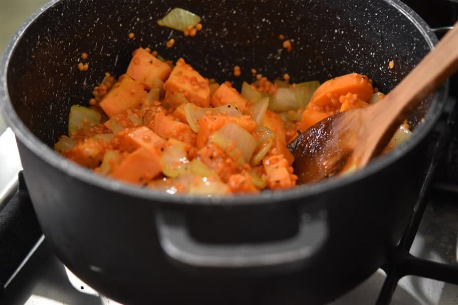 מוסיפים קוביות בטטה ועדשים כתומות וזהו.