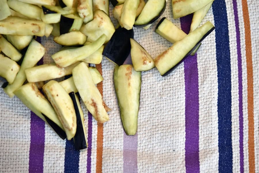 שוטפים את החצילים במים ומניחים על מגבת נקייה.