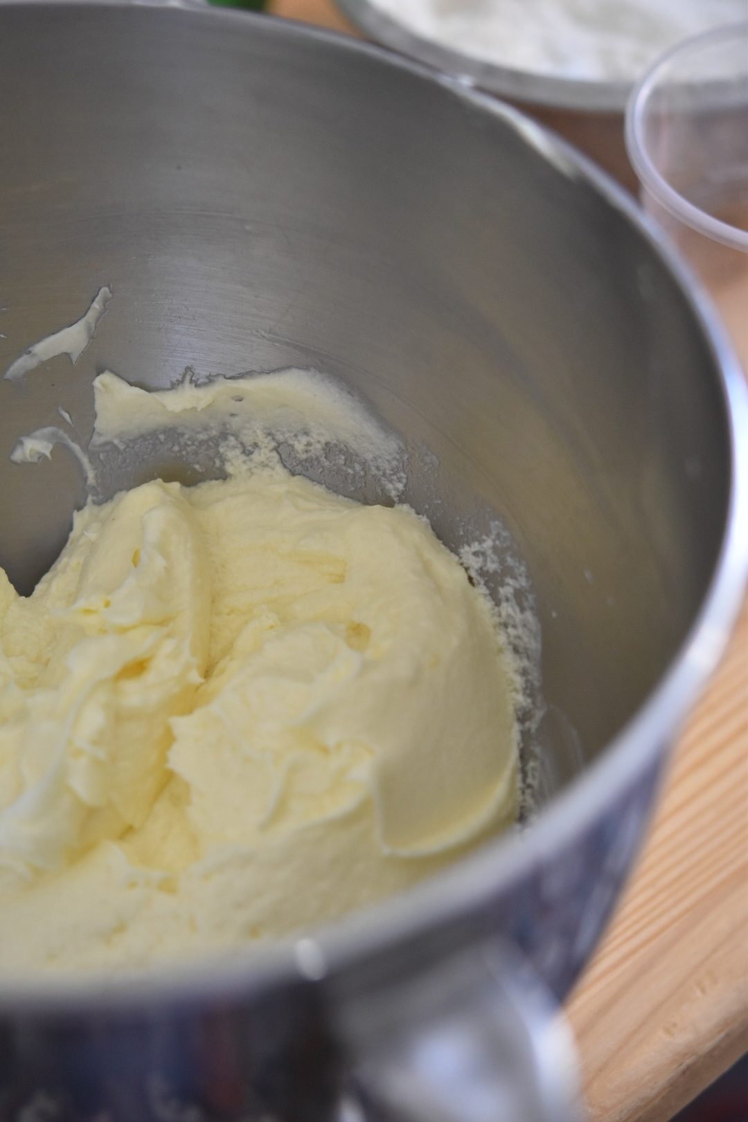חותכים את החמאה הרכה לקוביות ומוסיפים בהדרגה למיקסר, ממשיכים להקציף במהירות גבוהה.
