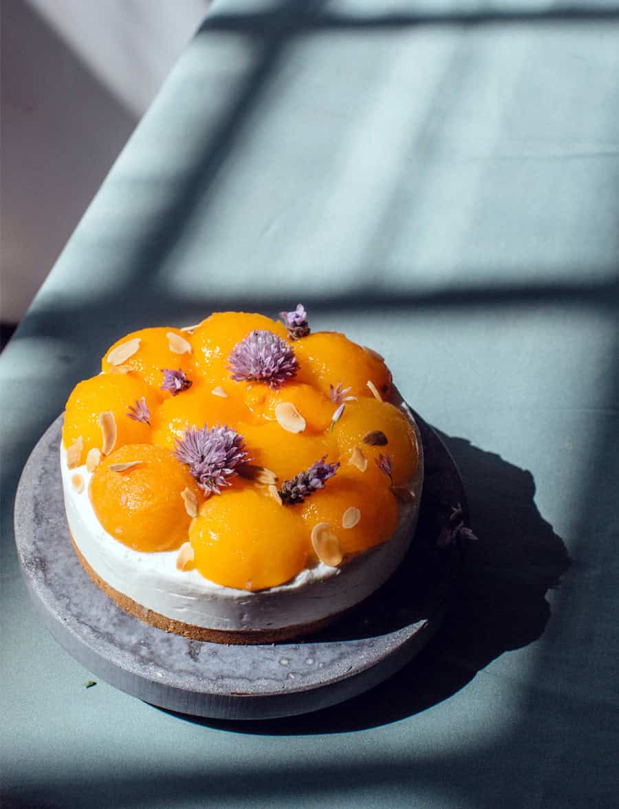 עוגת גבינה ושוקולד לבן עם משמשים צלויים