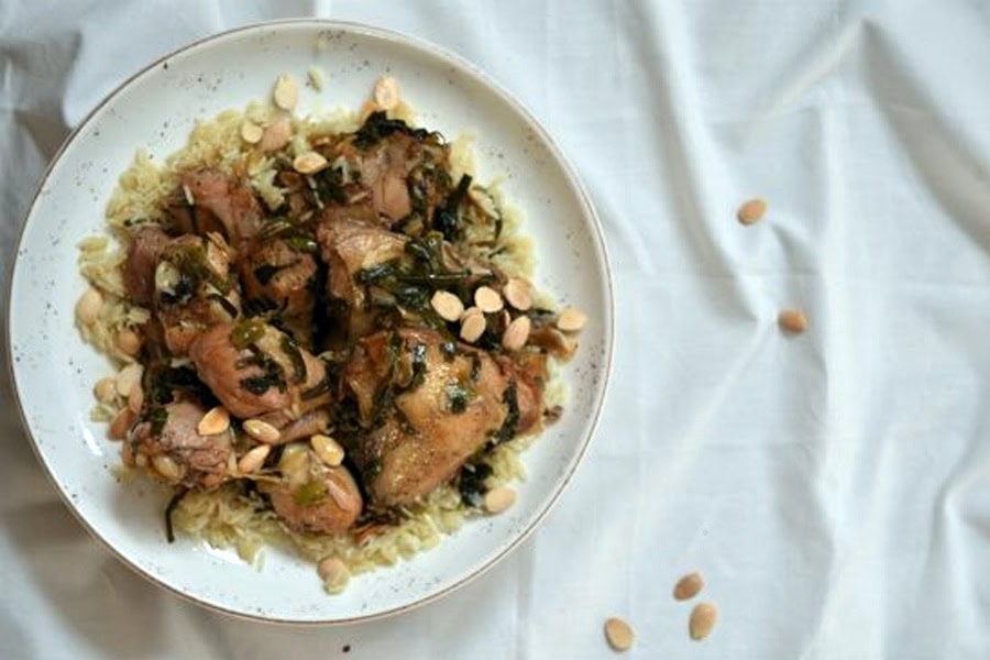 מפזרים על העוף שקדים קלויים ומגישים עם האורז.