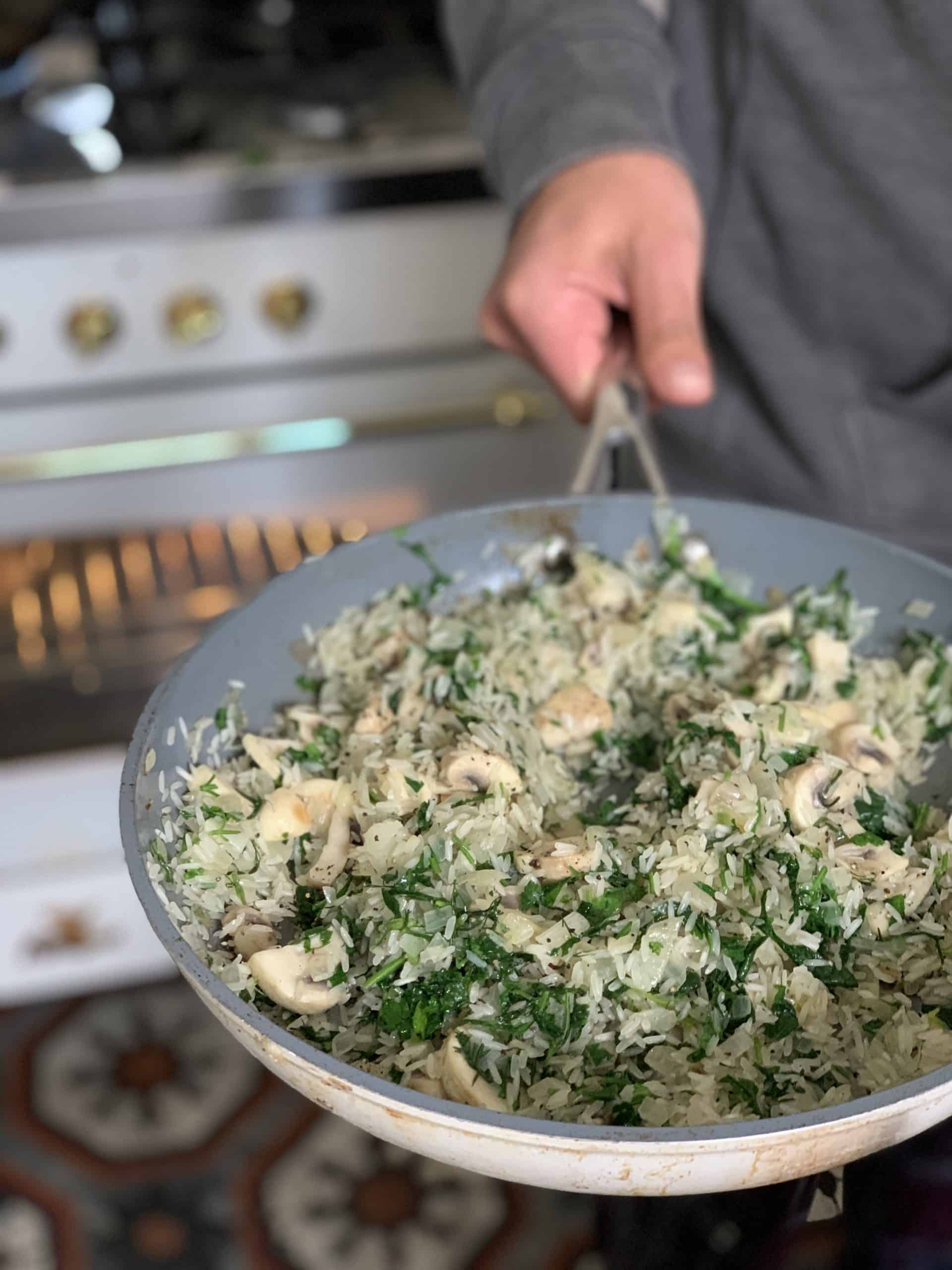 מוסיפים את האורז למחבת ומערבבים הכל יחד היטב היטב (אפשר להוסיף עוד קצת מלח).