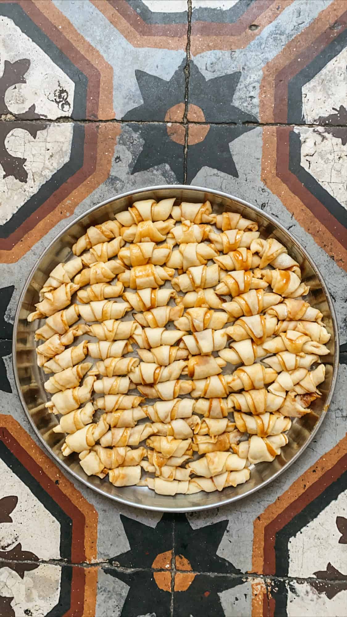 מגלגלים את המשולשים לרוגעלך, מסדרים בתבנית ומתפיחים להכפלת הנפח.