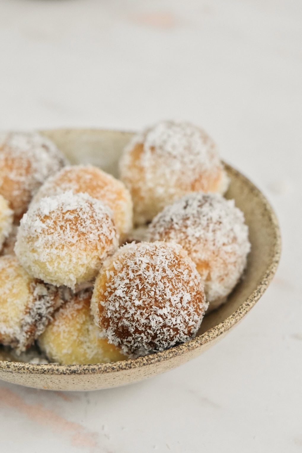 רוגעלך קטנים מבצק פריך מצופים המון קוקוס.