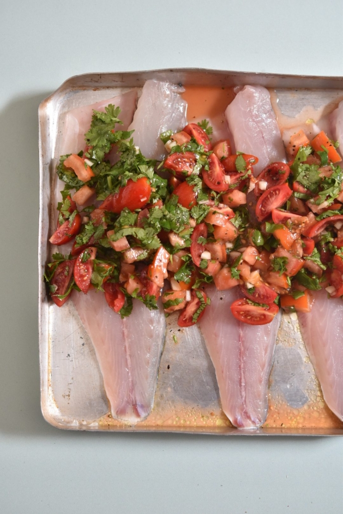 פילה לברק צלוי עם עגבניות, כוסברה ושום